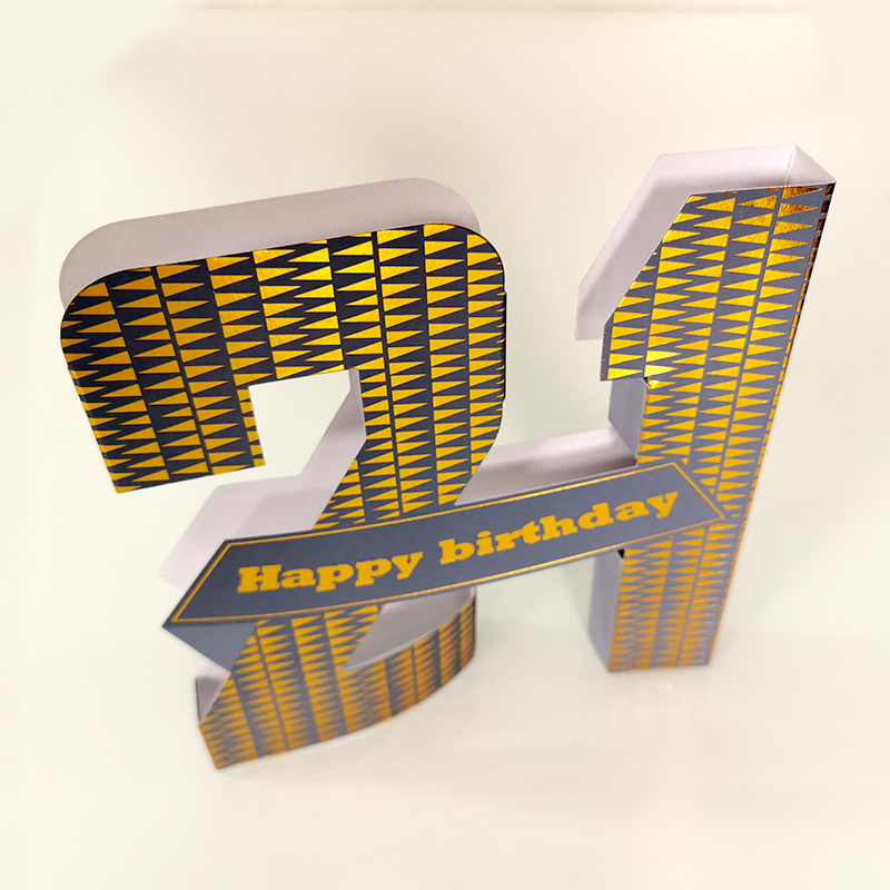Táto úžasná 3D karta je určená na narodeniny, či už ako gratulácia alebo ako dekorácia. Na zadnú stranu môžete napísať venovanie, vložiť do obálky a poslať alebo odovzdať osobne. Karta v tvare čísla výročia sa dá položiť na rovný povrch a vytvorí tak peknú dekoráciu osláv narodenín.
