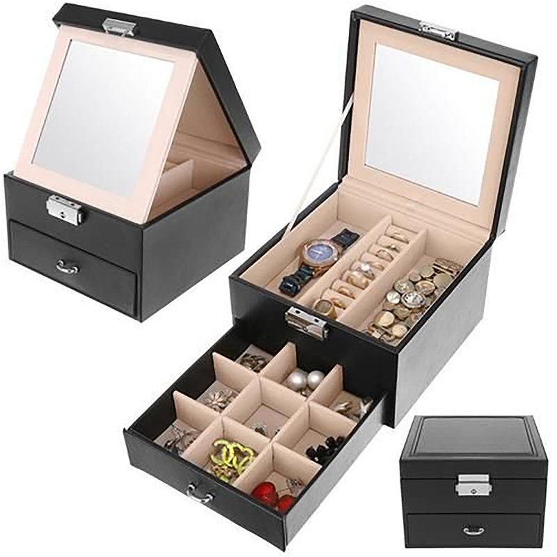 PRAKTICKÉ - kufrík pozostáva z dvoch poschodí. Prvé je výsuvná zásuvka s 9 malými priehradkami, ktoré vám umožnia umiestniť napríklad malé náušnice. Na druhej úrovni je dlhý rad priehradiek s valčekmi na prstene a dve veľké priehradky po stranách na ostatné šperky, ako sú retiazky, náramky, prívesky, hodinky a mnoho ďalších. Organizér je podšitý mäkkým materiálom, ktorý chráni jemné a hodnotné šperky pred poškriabaním.