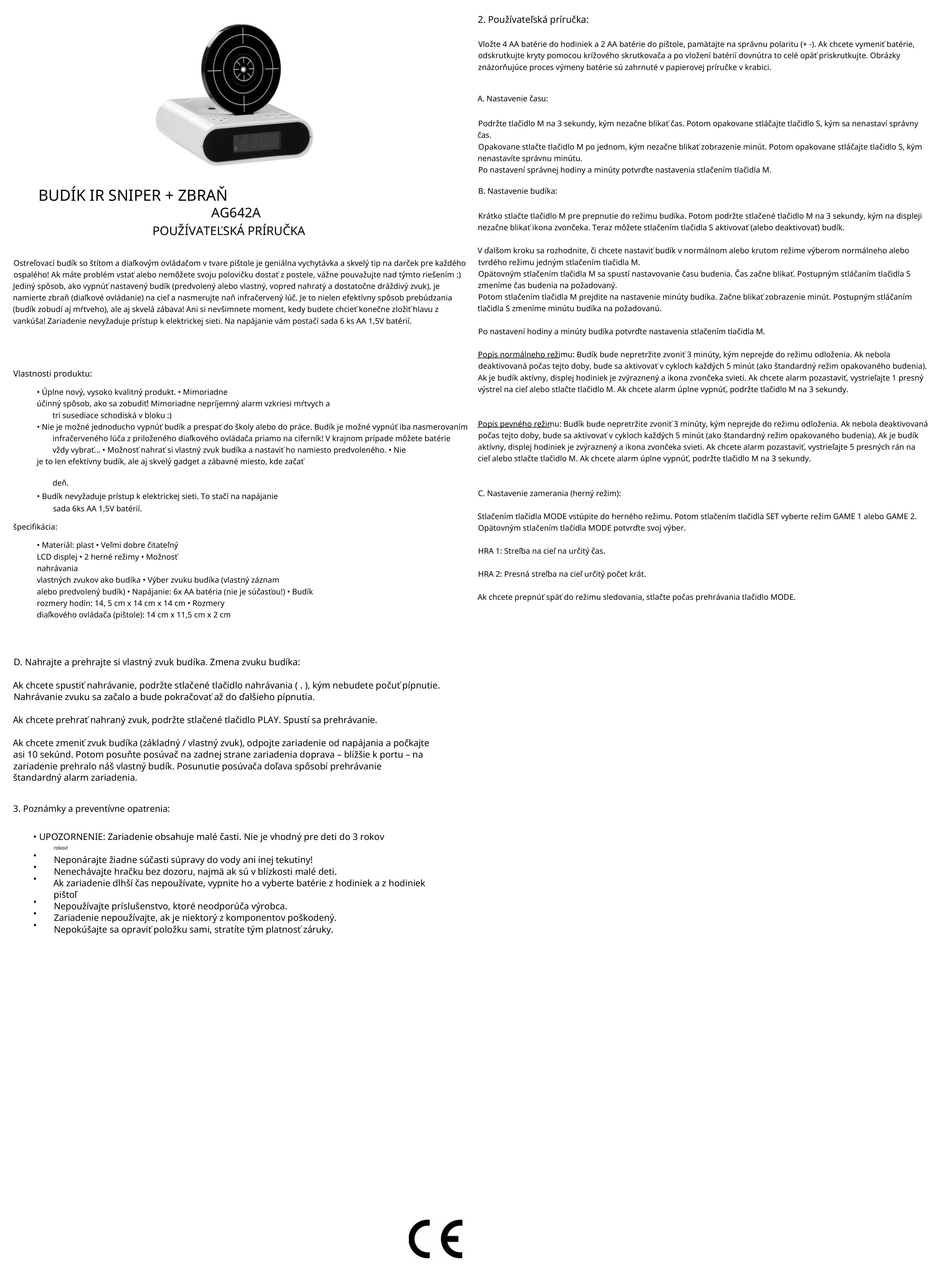 Jediný spôsob, ako vypnúť nastavený alarm (predvolený alebo vlastný, predtým nahraný a dostatočne dráždivý), je namieriť pištoľ (diaľkové ovládanie) na cieľ a nasmerovať naň infračervený lúč. Je to nielen efektívny spôsob prebúdzania (budík vzkriesi aj mŕtveho), ale aj skvelá zábava! Ani si nevšimnete moment, kedy budete chcieť konečne zložiť hlavu z vankúša!