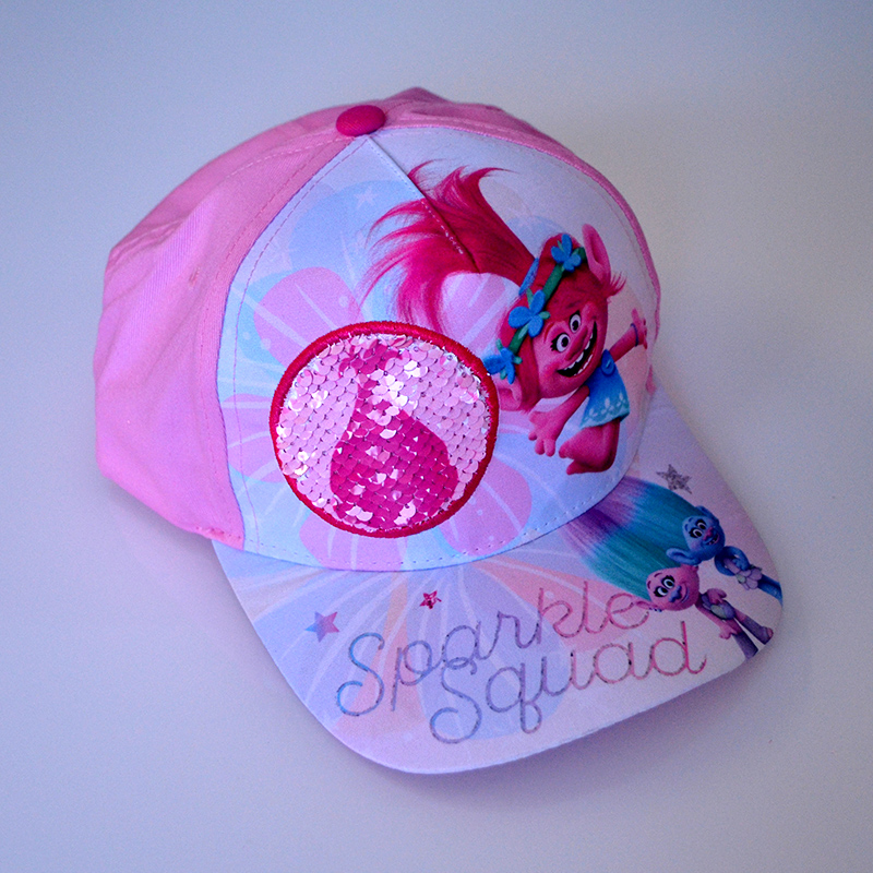 Detská čiapka so šiltom s rozprávkovým motívom. V zadnej časti má nastaviteľný remienok. V prednej časti má obrázok s trblietkami.