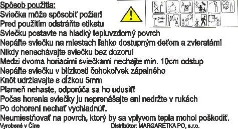 Upozornenie : Pri používaní sviečky dbajte na bezpečnostné opatrenia a dbajte na to, aby ste vhodným zaobchádzaním zabránili požiaru. Preto nenechávajte horiacu sviečku bez dohľadu, a zabráňte rozliatiu parafínu a kontaktu s horľavými predmetmi.