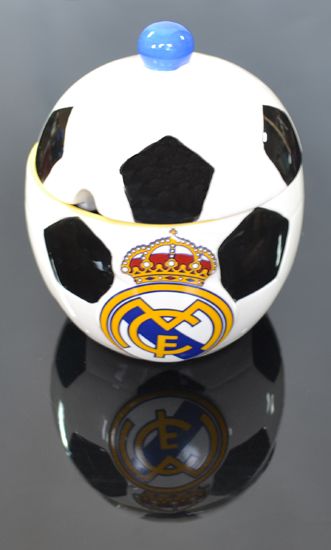Keramická cukornička s emblémom futbalového klubu Real Madrid, ktorá sa skladá z troch dielov, cukornička, veko, lyžička. Zabalený je v kartóniku. Darček vhodný pre fanúšikov futbalu, obzvlášť " bieleho baletu".