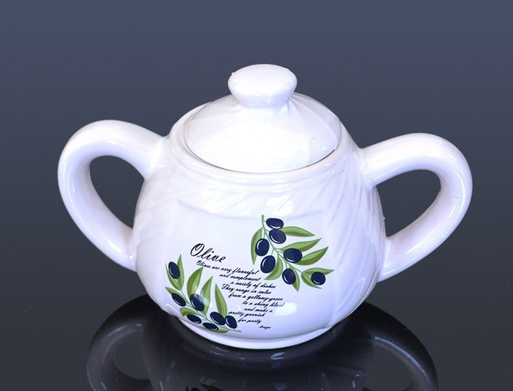 Keramická cukornička s dekoráciou plodov olív. Vhodný doplnok do kuchyne, ako ako dekorácia do domácnosti.