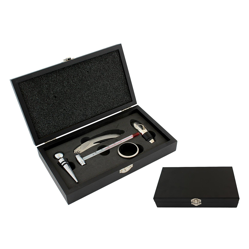 Bohatá súprava (5 dielov) na víno zabalená v estetickej drevenej krabičke.