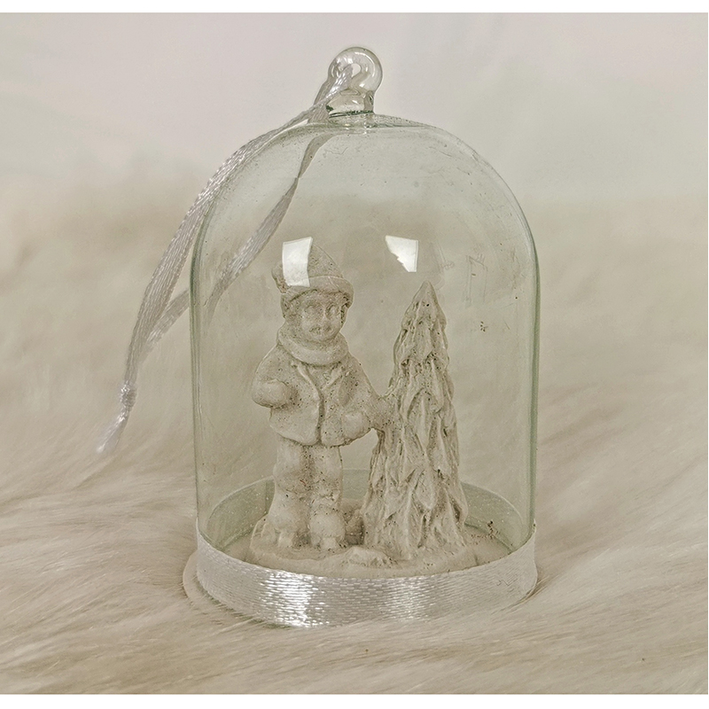 Nádherná dekorácia chlapček pri stromčeku v sklenenej dekorácii.