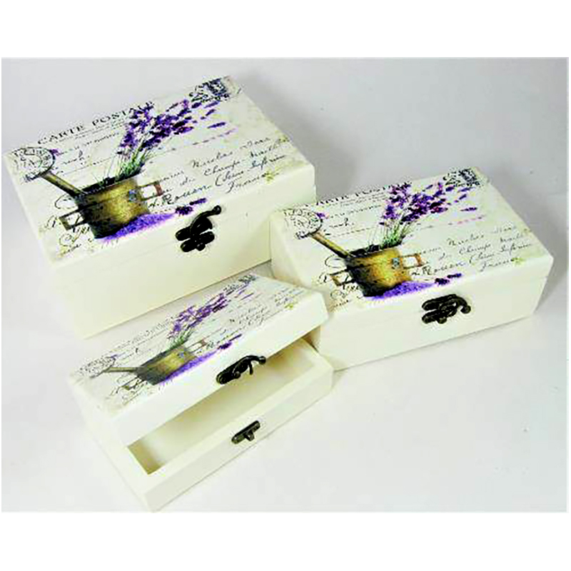 Krabičky sú vyrobené z prírodného dreva dekorované obrázkami s levanduľou, ktoré je kvalitne spracované. Majú zatvárateľný príklop s patentovým zámkom.