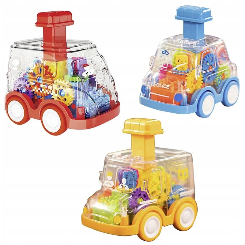 Autíčko vo vnútri má 3 farebné figúrky a ozubené kolesá, ktoré sa počas jazdy pohybujú. Stačí stlačiť páku na streche a sledovať, ako letí dopredu. Dieťa môže tiež pohybovať autom dopredu a dozadu a jazdiť na podlahe alebo stole. Pohyblivé kolieska a priehľadný kryt umožňujú deťom pozorovať pohybujúce sa ozubené kolesá, čím vzbudzujú značný záujem.