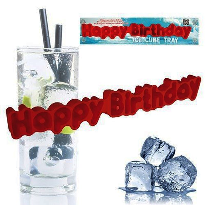 Silikónová formička na ľad Happy birthday červenej farby. Dá sa v ňom vyrobiť až 13 ľadových písmen na schladenie nápojov. Darček určený na narodeniny. Zabalené na karte. Cena s DPH.