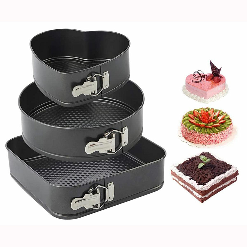 Sada 3 kovových tortových foriem rôznych tvarov (obdĺžnikové, okrúhle a srdcové). Umožňuje vám rýchlo a pohodlne upiecť koláč. Použitie špeciálnej zliatiny umožňuje rýchle zahriatie formy a dlho udrží teplo. Pevné rukoväte umožňujú ľahké otváranie a zatváranie foriem. Hrubý povrch dna sťažuje lepenie cesta pri pečení.
