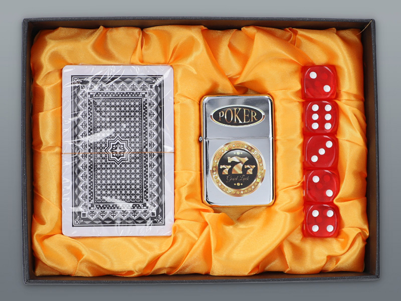 Darčeková sada, ktorú tvorí benzínový zapaľovač, balíček žolíkových kariet a 5 hracích kociek. To všetko zabalené v darčekovej kazete vystlanej jemným saténom. Farba saténu sa môže líšiť od obrázku.