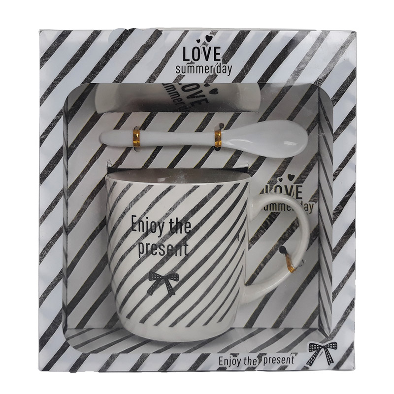 Originálny hrnček z kolekcie LOVE summer day s nápisom, lyžičkou a podšálkou, ktorý je zabalený v elegantnej krabičke. Výška hrnčeka je 9,5 cm.