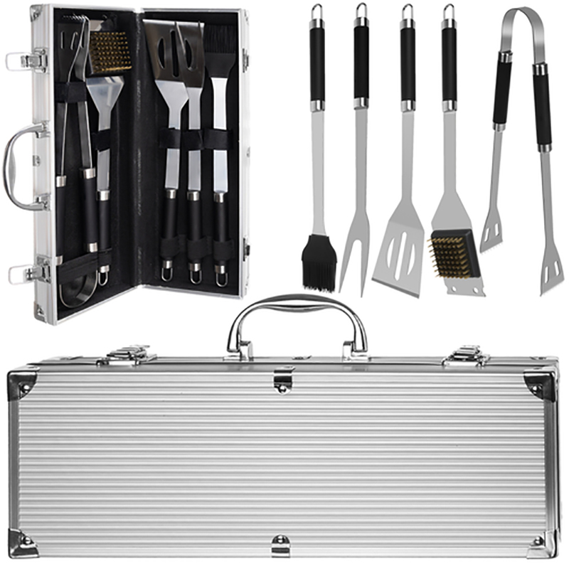 ŠPECIFIKÁCIA - materiál: nehrdzavejúca oceľ; rozmery príborov: kefa (dĺžka / šírka): 35 x 4,5 cm; vidlica (dĺžka / šírka): 35 x 3cm; lopatka (dĺžka / šírka): 35 x 8 cm; štetec (dĺžka / šírka): 35 x 6cm; kliešte (dĺžka / šírka): 35 x 4,5 cm; rozmery kufra: 37/14 / 7cm; hmotnosť: 1,189 kg.