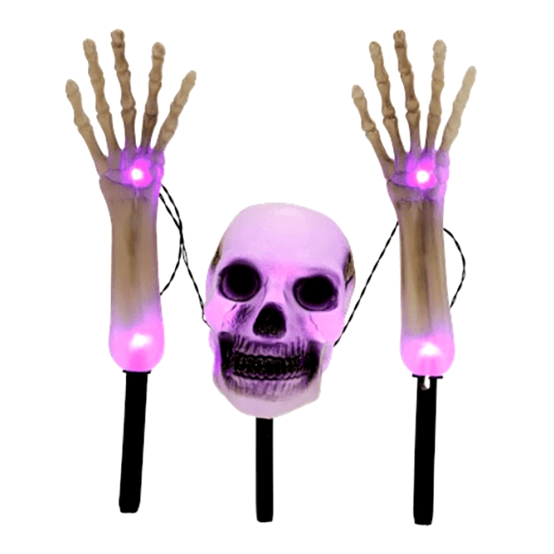 Lebku zapichnete do zeme a vedľa nej zapichnete ruky. Túto dekoráciu môžete zapnúť a bude svietiť, čo je ideálne na večer keď je tma. Vaša lebka s rukami tak bude takto vynikať na záhrade alebo pred domom aj počas tmavých večerov či nocí.