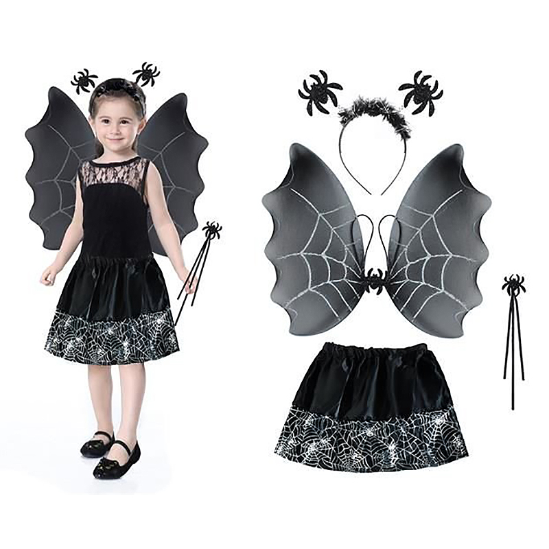 Kostým čarodejnice skladajúceho sa zo štyroch častí - čelenka s pavúkmi, krídla, sukňa a čarovná palička. Dokonalý kostým na karneval aleb párty. Vhodný pre deti od troch rokov.
