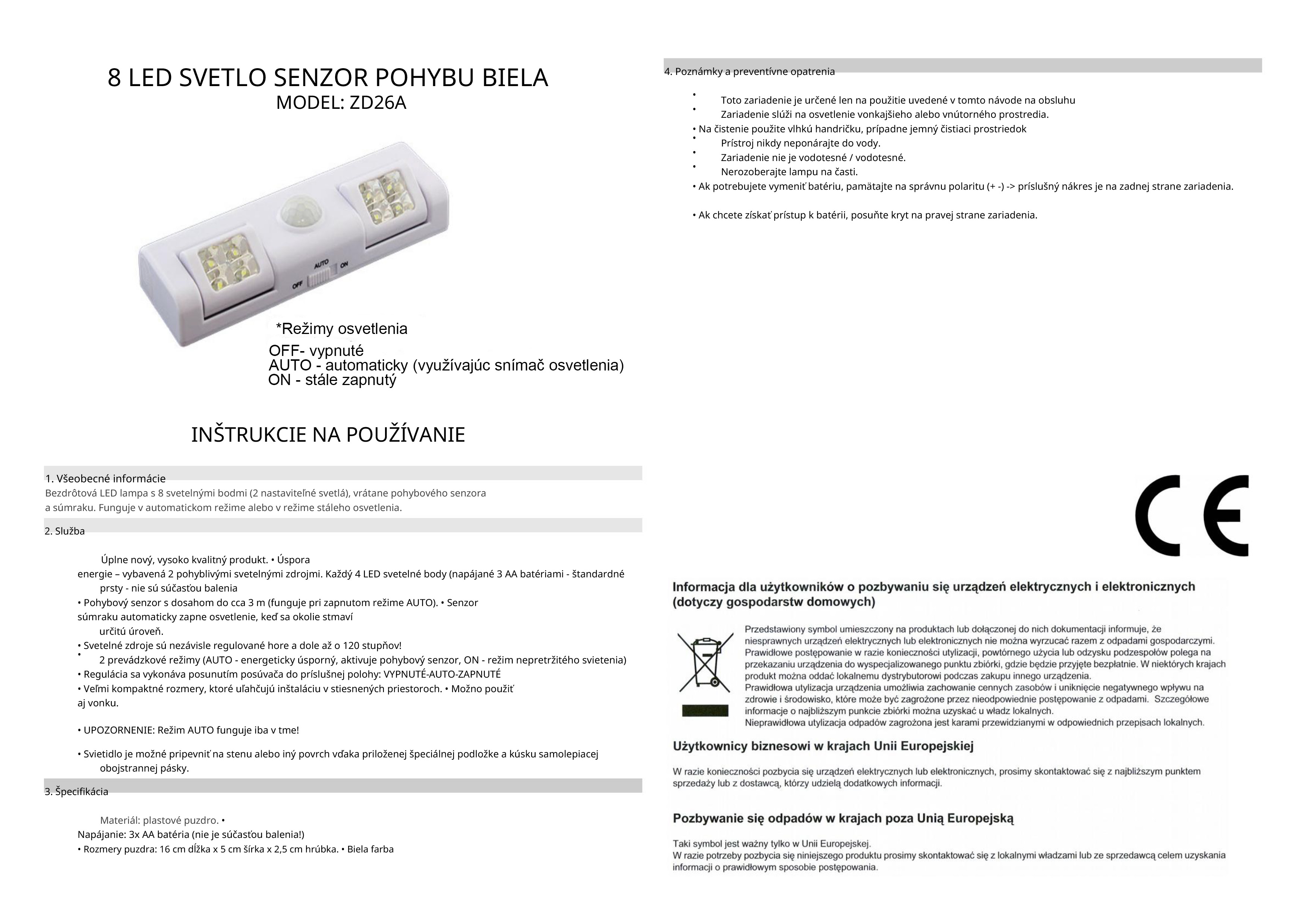 Úspora energie - vybavená 2 pohyblivými svetelnými zdrojmi. Každé 4 LED svetelné body (napájané 3 AA batériami)