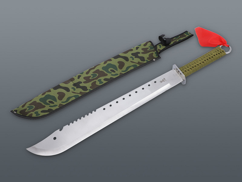 Masívna mačeta so šnúrkovanou rúčkou khaki farby. Mačeta je skvelá na preriedenie kríkov a konárov, kosenie vegetácie alebo kempovanie. Je to všestranný, efektívny a spoľahlivý nástroj do prírody. Rukoväť mačety je ergonomická, čo zaručuje bezpečné použitie. S mačetou zaobchádzajte opatrne, uchovávajte ju mimo dosahu detí a používajte iba na určené účely. Mačeta je celokovová, vyrobená z nerezovej ocele. K mačete dostávate aj praktické nylonové púzdro.