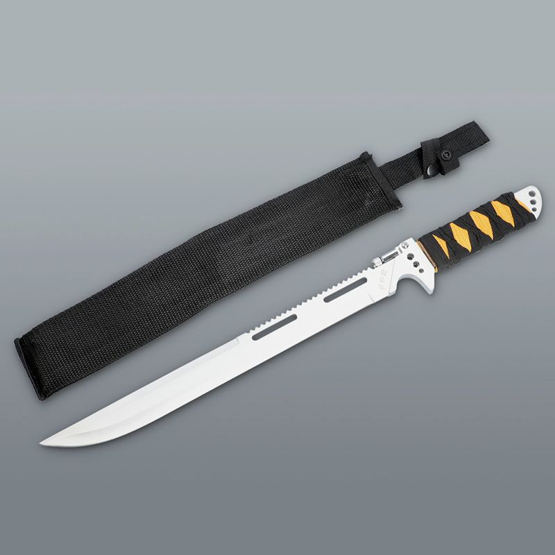 Mačeta so šnúrkovanou rúčkou čiernej a žltej farby. Mačeta je skvelá na preriedenie kríkov a konárov, kosenie vegetácie alebo kempovanie. Je to všestranný, efektívny a spoľahlivý nástroj do prírody. Rukoväť mačety je ergonomická, čo zaručuje bezpečné použitie. S mačetou zaobchádzajte opatrne, uchovávajte ju mimo dosahu detí a používajte iba na určené účely. Mačeta je celokovová, vyrobená z nerezovej ocele. Na rúčke má pripojené svietidlo, ktorým si môžete prisvietiť v šere alebo v tme. K mačete dostávate aj praktické nylonové púzdro.