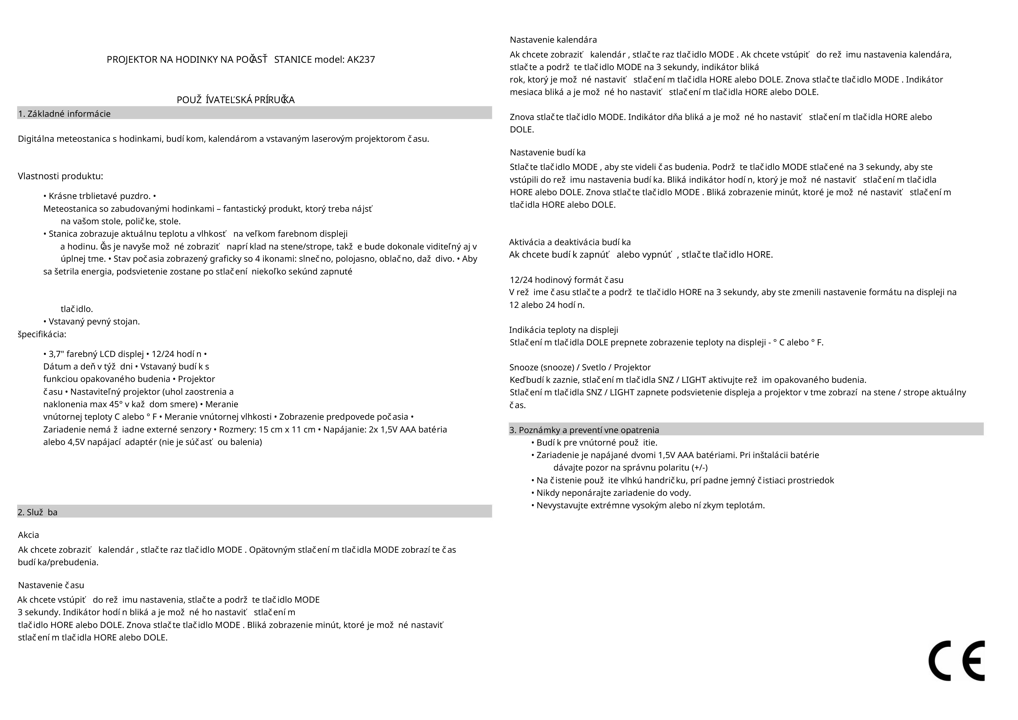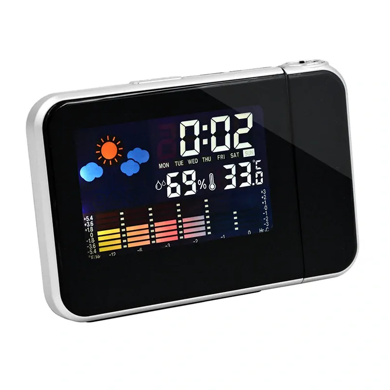 Digitálna meteorologická stanica s hodinkami, budíkom, kalendárom a vstavaným laserovým projektorom času. Zariadenie má veľký a čitateľný 3,7 '' farebný LCD displej, ktorý zobrazuje meranie vnútornej teploty v stupňoch Celzia alebo Fahrenheita, vlhkosť vzduchu v % a aktuálnu a predpovedanú predpoveď počasia. Vstavaný, nastaviteľný projektor vám umožní čítať čas aj v úplnej tme. Vďaka konzistentnému a tlmenému štýlu stanice bude perfektne harmonizovať s okolím.