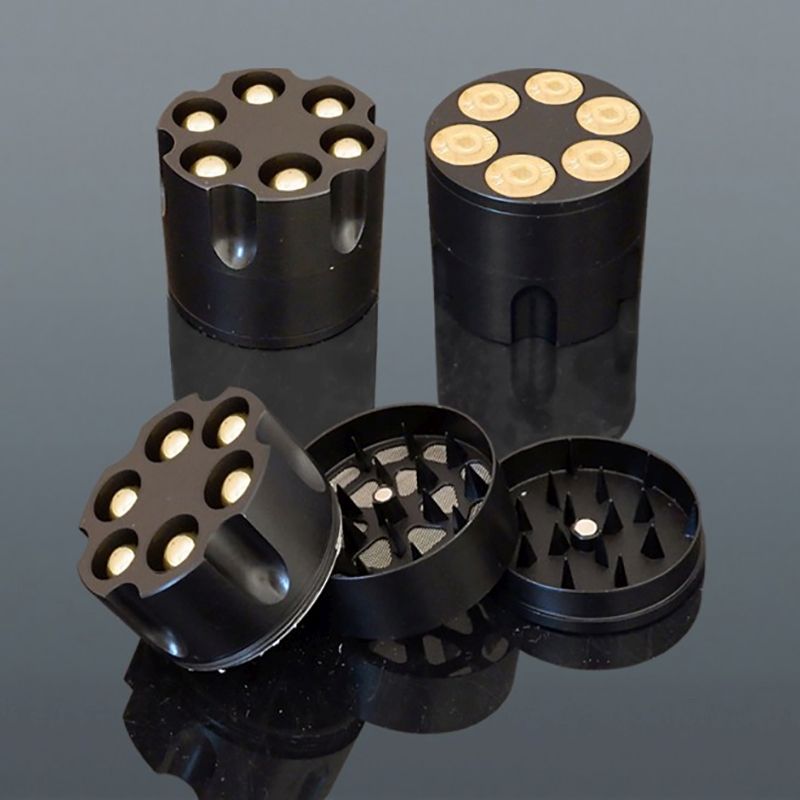 Mlynček na bylinky v tvare zásobníka do revolvera vyrobený z nerezovej ocele skladajúci sa z troch častí o priemere 4,2 cm, výšky 4,3 cm a hmotnosti cca 100g.
