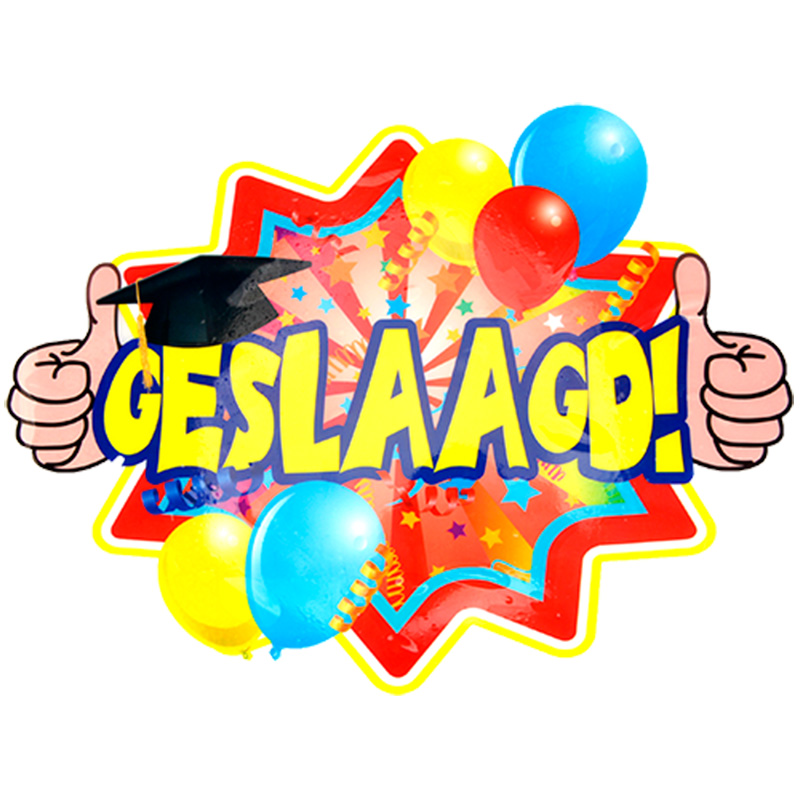 Nálepka na okno s holandským nápisom Geslaagd!, čo v preklade znamená gratulácia alebo úspech. Nálepka je v zrkadlovom prevedení, lepí sa na okno zvnútra.