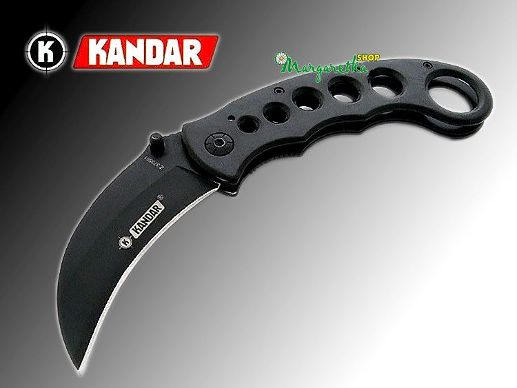 Skladací celokovový nôž čiernej farby vyrobený z kvalitnej nerezovej ocele 440 typu " KARAMBIT ". Technické údaje: dĺžka - 19cm, dĺžka čepele - 8cm, šírka čepele - 2,5mm, hmotnosť - 178g, poistka - frame/lock. Nôž typu karambit je vyrobený podľa indonézskeho vzoru nožov slúžiacich na sebaobranu. Je charakteristický ohnutou čepeľou a otvorom na konci. Vzhľadom na jednoduchosť noža je veľmi rýchlo použiteľný pri boji a sebaobrane. Vďaka použitiu najkvalitnejších materiálov na jeho výrobu i otvoru na palec sa perfektne drží v ruke a ovláda. Na rukoväti sa nachádza klip, ktorým ho možno upevniť na opasok. Na predaj s veľmi ostrou čepeľou, zabalený v krabičke. Do čepele je možné gravírovať text.