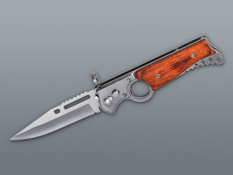 Nôž s drevenou rukoväťou a kvalitnou čepeľou z nerezovej ocele. Vyskakovacia čepeľ z boku pomocou tlačidla. Bezpečnostná poistka na rukoväti. Celková dĺžka noža: 23cm, dĺžka čepele: 10cm. Možnosť gravírovania mena, venovania atď. do čepele (za príplatok). Vďaka gravírovaniu sa tento nôž stáva dokonalým osobným darčekom. Vynikajúca kvalita za super cenu. Kvalitná a pekná vyskakovačka hlavne pre hubára, poľovnika, turistu, či rybára. Súčasťou ceny je aj púzdro na nôž, ktoré si môžete pripnúť na opasok.