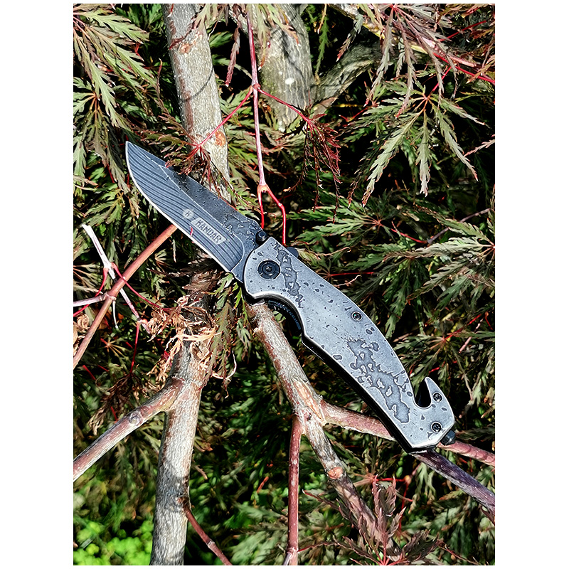 Záchranársky masívny a veľmi kvalitný nôž Kandar Grey sivej farby s rúčkou z kovu. Nôž má úderník na rozbitie skla, čepeľ na odrezanie pásov a klip, ktorý môžete pripevniť k opasku. Pekný darček pre každého šoféra, horolezca, turistu, ale aj pre bežné použitie. Možnosť gravírovania do čepele.