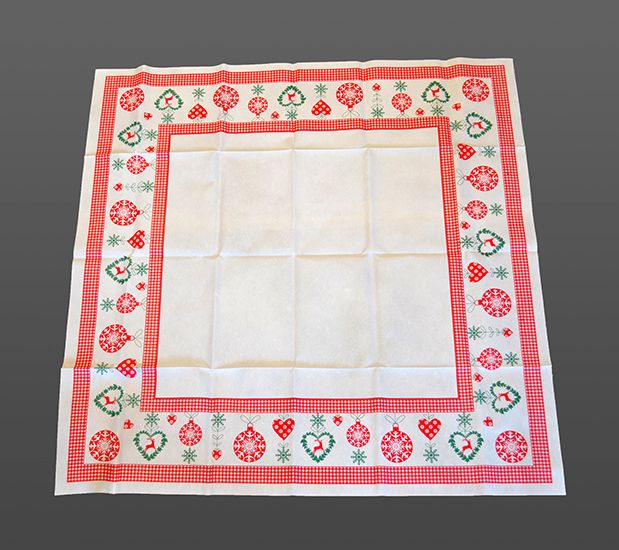 Obrus s vianočným motívom značky Alouette vyrobený z pevného hodvábneho papiera. Rozmer: 80x80cm. Vyrobený v Nemecku. Zabalený v igelitovom vrecku.