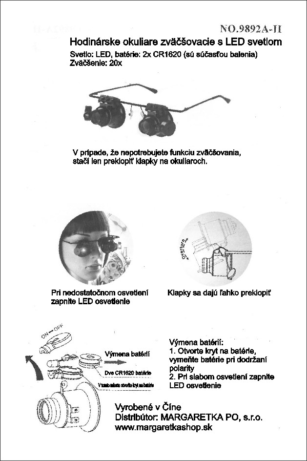 Každý, kto pracuje s jemnou mechanikou alebo malými zariadeniami, či už je to hodinár, modelár, elektrotechnik, botanik, alebo opravár elektronických zariadení (napr.mobilných telefónov), určite ocení tieto vynikajúce pomocné okuliare. Zväčšovacie skla sú uložené na ráme okuliarov, takže máte voľné ruky pri práci.