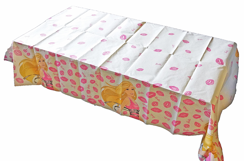 Obrus s motívom Barbie vyrobený z pevného hodvábneho papiera (imitácia textilu). Rozmer: 120x180cm. Vyrobený v Taliansku. Zabalený v igelitovom vrecku.