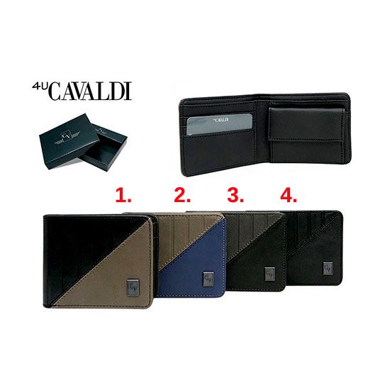Peňaženka z kolekcie Cavaldi, známeho výrobcu peňaženiek, je určená najmä pre pánov. Peňaženka má priehradku na bankovky, vrecko na mince, zatvárateľné kovovým patentom, a priehradky na karty alebo doklady. Je vyrobená z kvalitnej brúsenej ekokože. Na prednej strane má kovový štítok s logom výrobcu. Peňaženka je zabalená v darčekovej krabičke priamo od výrobcu a preto sa hodí ako darček pre blízku osobu.