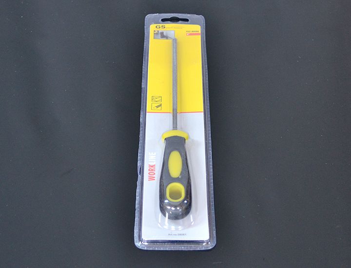 Pilník na kov s okrúhlym profilom značky GS. Celková dĺžka pilníka je 26 cm a dĺžka časti na pilníkovanie je 15,4 cm. Pilník má rúčku z pevného plastu. Zabalený je v blistri.
