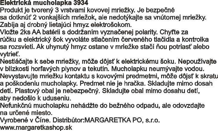 Výhodou tejto placačky na muchy je nesporne to, že pri likvidovaní hmyzu nezanechýva stopy na stenách alebo iných zariadeniach v domácnosti. Stačí len stlačiť gombík na aktiváciu napätia a mávať placačkou, a keď sa hmyz dostane do účinnej plochy - priestoru siete - napätie ho zneškodní. Ak ju chcete vypnúť, stačí pridržať gombík. Iba tak bude mucholapka bezpečná a predĺžite jej životnosť.