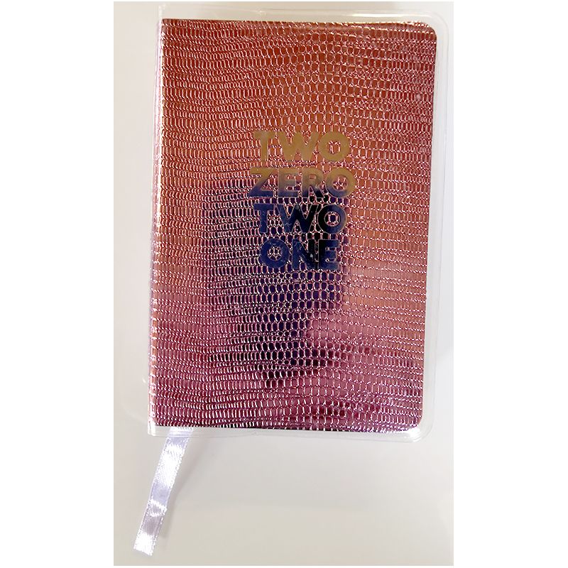 Plánovací diár veľkosti A7 AGENDA 2021 s glitrovým paperbackom v igelitovom obale.