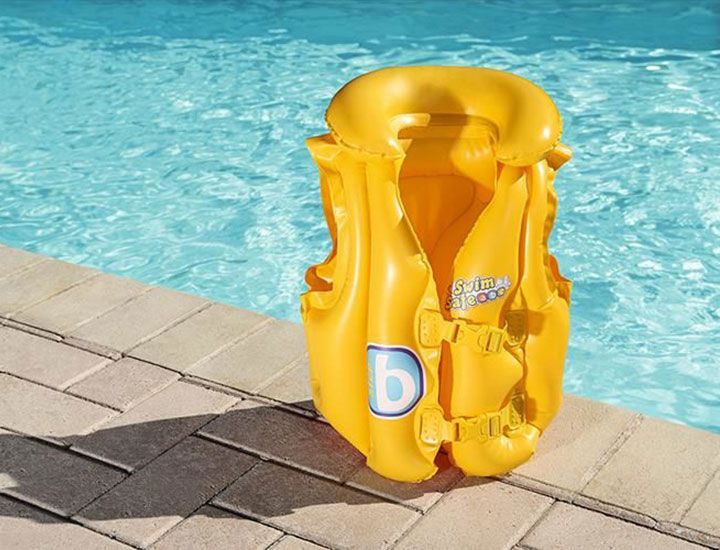 Nafukovacia detská plávacia vesta je odolná voči poškodeniu vďaka tomu, že je vyrobená z pevného vinylu. Hladký povrch vesty zabezpečuje komfortné nosenie pre každé dieťa. Vďaka trom nafukovacím komorám a zarážkam na nafukovanie ju robia ešte viac bezpečnou, ako u obyčajných viest. Nafúknutý golier poskytuje dieťaťu istotu, keď sa hrá vo vode alebo keď sa učí plávať. Zapína sa pomocou dvoch popruhou s rýchlym zapínaním a odopínaním.