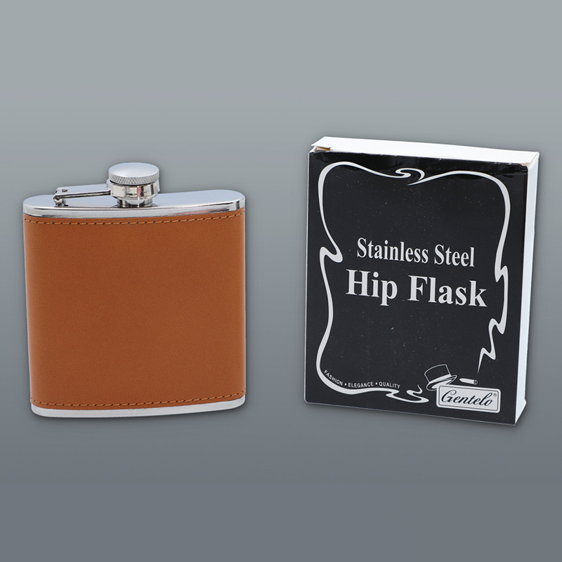 Ploskačka z nerezovej ocele s dekorom z hnedej ekokože s obsahom 6 Oz. - cca 180ml. Do svetlej kože ploskačky je možné gravírovať text, ktorý bude pekne kontrastovať s farbou kože. Preto je ideálna na gravírovanie.