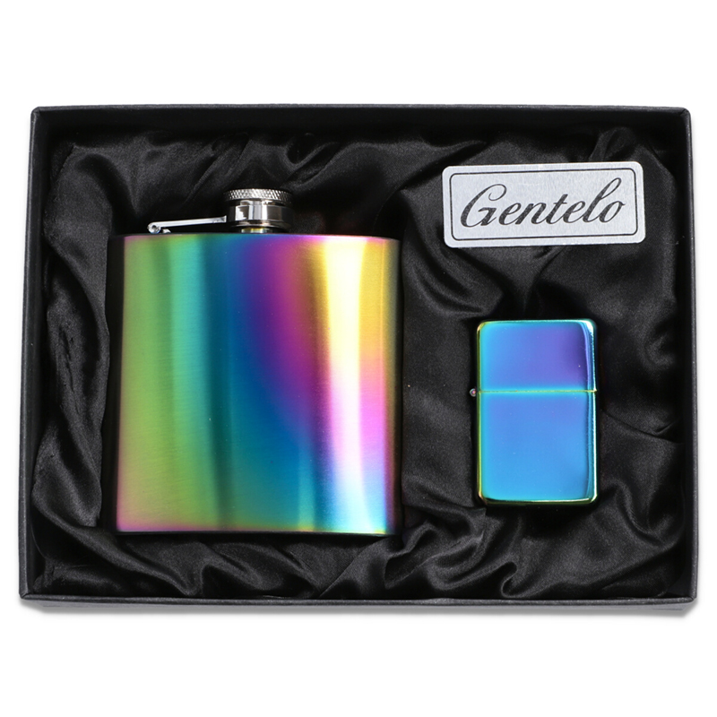 Darčeková sada pozostávajúca z ploskačky a benzínového zapaľovača. Všetky komponenty sú vyrobené z vysokokvalitnej nerezovej ocele v dúhovanej farbe. Všetko je zabalené v elegantnej kazete vystlanej hebkým saténom. Tento produkt je vhodným darčekom hlavne pre mužov, poľovníkov, rybárov, či turistov.