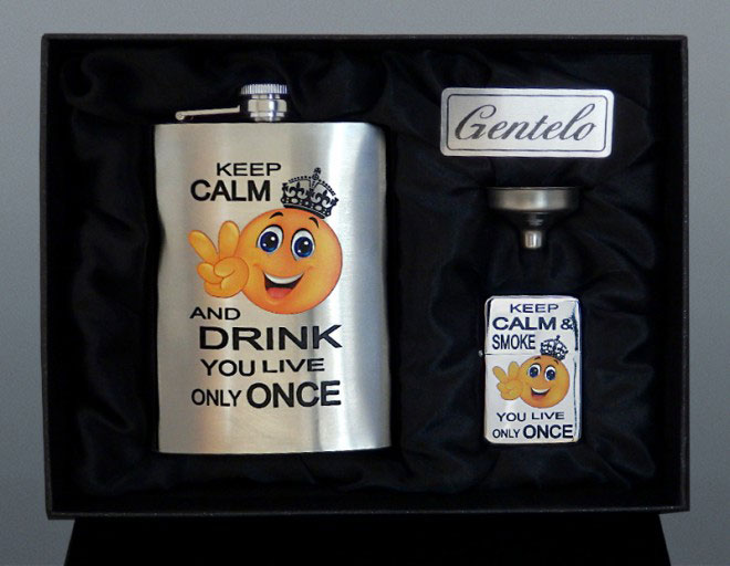 Darčeková sada pozostávajúca z ploskačky, lievika a benzínového zapaľovača. Ploskačka je s nápisom "KEEP CALM AND DRINK". Všetky komponenty sú vyrobené z vysokokvalitnej nerezovej ocele. Všetko je zabalené v elegantnej kazete vystlanej hebkým saténom. Tento produkt je vhodným darčekom hlavne pre mužov, poľovníkov, rybárov, či turistov.