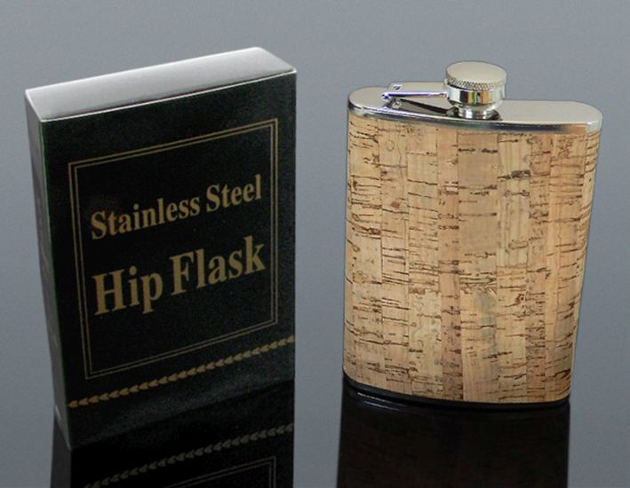 Ploskačka s korkovým obalom s obsahom 8 Oz. - 240ml. Rozmery 9x2,5x11 cm.