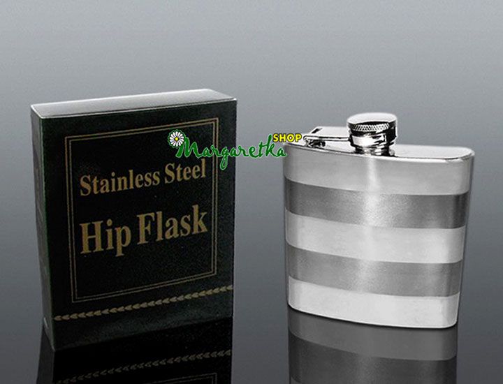 Ploskačka z nerezovej ocele s pruhovaným dekorom o obsahu 7 Oz. - 210 ml. Na predaj v krabičke.