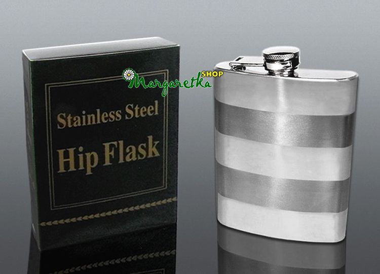 Ploskačka z nerezovej ocele s pruhovaným dekorom o obsahu 8 Oz. - 240 ml. Na predaj v krabičke.