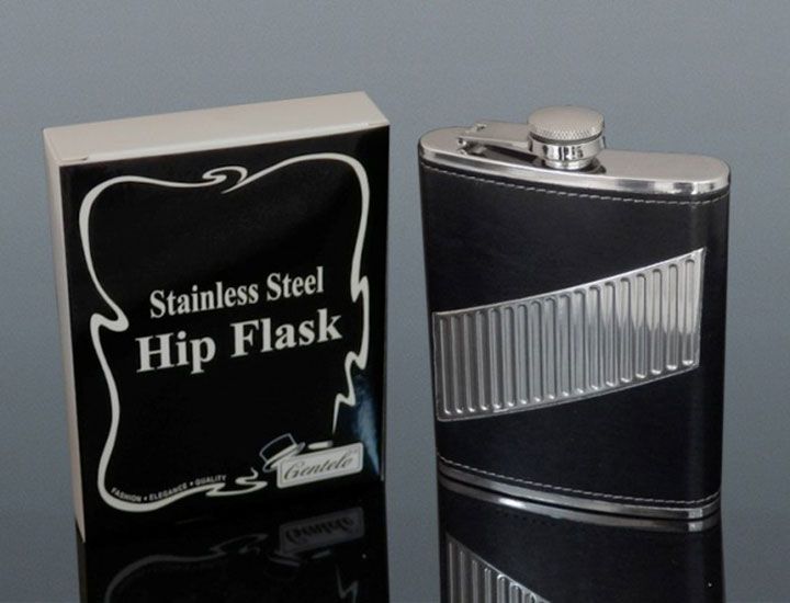 Ploskačka strieborná potiahnutá ekokožou v čiernej farbe s obsahom 7 Oz.- 210ml. Táto ploskačka je vhodný darček hlavne pre muža.