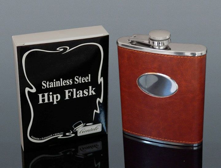 Ploskačka strieborná potiahnutá ekokožou v hnedej farbe s obsahom 7 Oz.- 210ml. Táto ploskačka je vhodný darček hlavne pre muža.