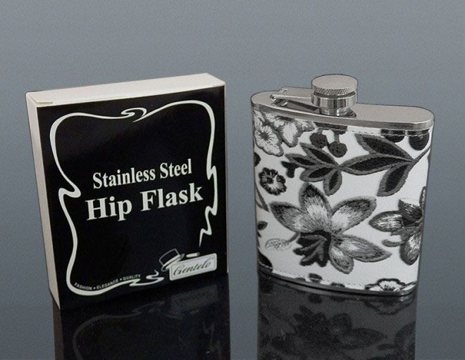 Ploskačka strieborná potiahnutá ekokožou s dekorom kvetov v čiernobielej fabre s obsahom 7 Oz.- cca 210 ml.