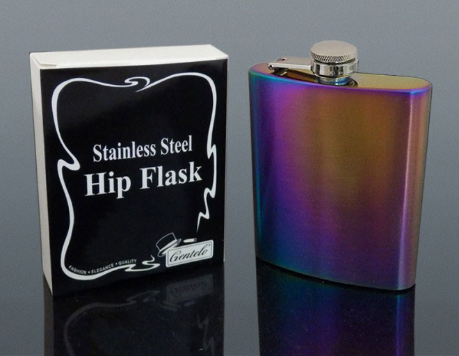 Ploskačka nerezová dúhová s obsahom 8 Oz.- 240ml. Táto ploskačka je vhodný darček pre ženu ako aj pre muža. Možnosť gravírovania textu (za poplatok). Cena s DPH.