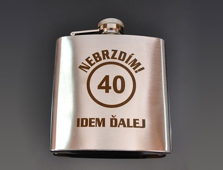 Ploskačka nerezová striebornej farby s gravírovaným motívom Nebrzdím, idem ďalej. Do kruhu je možné zvoliť si iné číslo ako je vyobrazené. Požadované číslo uveďte do poznámke pri vypĺňaní objednávky. Ploskačka má obsah 6Oz.- 180ml. Táto ploskačka je vhodný darček pre ženu ako aj pre muža.