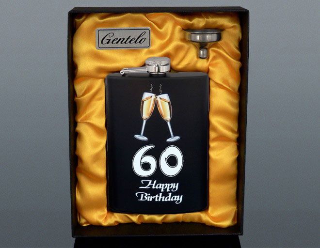 Ploskačka s dekorom - Všetko najlepšie k 60tke. Obsah má 240 ml. Zabalená je v krabičke.