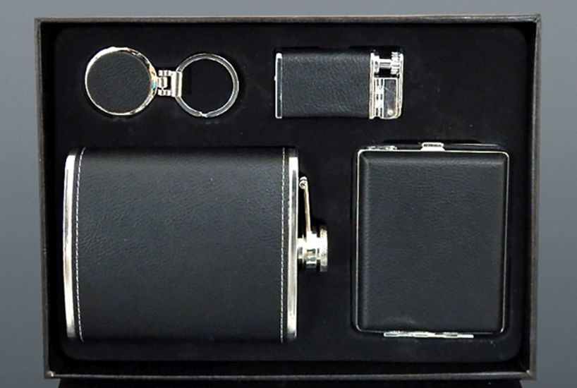 Darčekovú sadu tvorí turistická fľaša - ploskačka, piezoelektrický zapaľovač, tabatierka a kľúčenka. Všetko je vyrobené z vysokokvalitnej nerezovej ocele a všetky komponenty darčekovej sady sú obalené v eko-koži. Všetko je uložené v elegantnej darčekovej kazete. Skvelý darček pre každého muža.