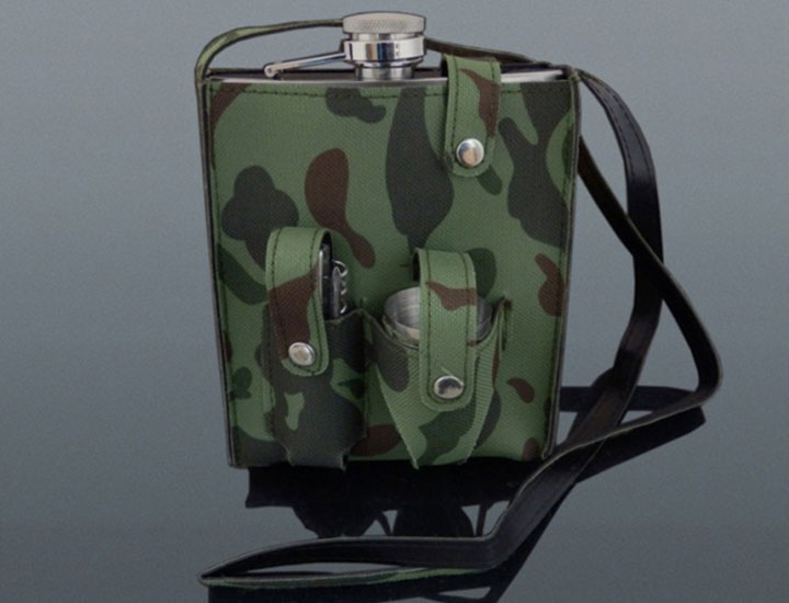Nerezová ploskačka striebornej farby v sade s turistickými pohárikmi a multifunkčným nožom. Poháriky aj púzdro sú dekorované v štýle army.