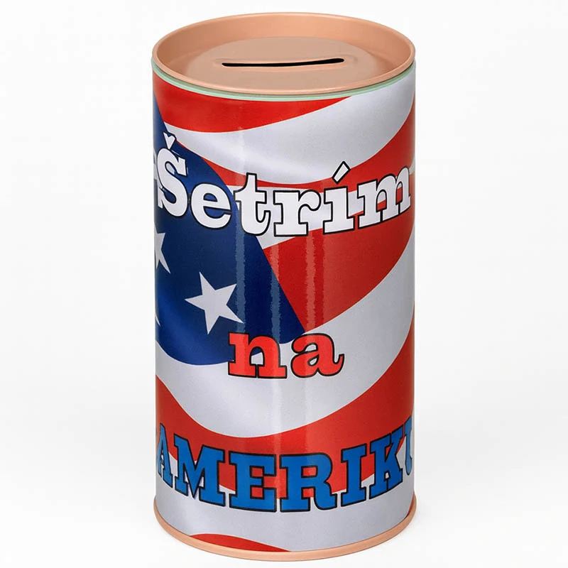 Plechová pokladička šetrím na Ameriku. Originálny pekný darček. Cena s DPH.